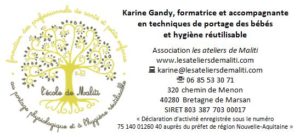 Karine Gandy, la formatrice, s’est formée auprès de plusieurs écoles de portage, tant en formations de base, qu’en formation continue au fil des années. Ainsi ses compétences lui permettent d’accompagner dans différentes pathologies, prématurité, handicap du porteur ou de bébé, reflux…