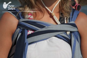 En portage sur le dos, au lieu de faire un double noeud ou noeud plat sur le ventre, on repasse les pans dans les bretelles des épaules, sans faire de noeud (le tissu reste stable). Ceci permet d’avoir le poids moins sur les épaules et plus réparti sur la poitrine. Utile également en cas de grossesse.