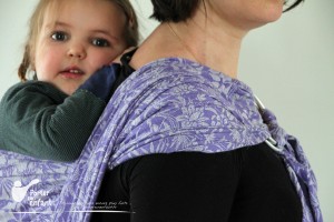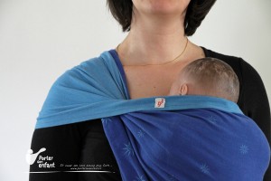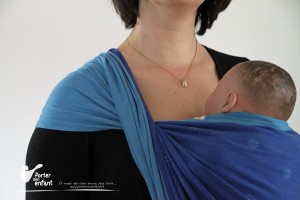 L’ourlet supérieur, qui se trouve derrière la nuque du bébé, est passé SOUS le tissu et l’ourlet inférieur, qui se retrouve sur le haut de l’épaule. Le tissu reste mieux en place ainsi. Plus difficile à réaliser en « volte partielle » car le tissu est plus délicat à manipuler, on l’utilise plus souvent en « volte complète » pour obtenir une tension pli par pli.